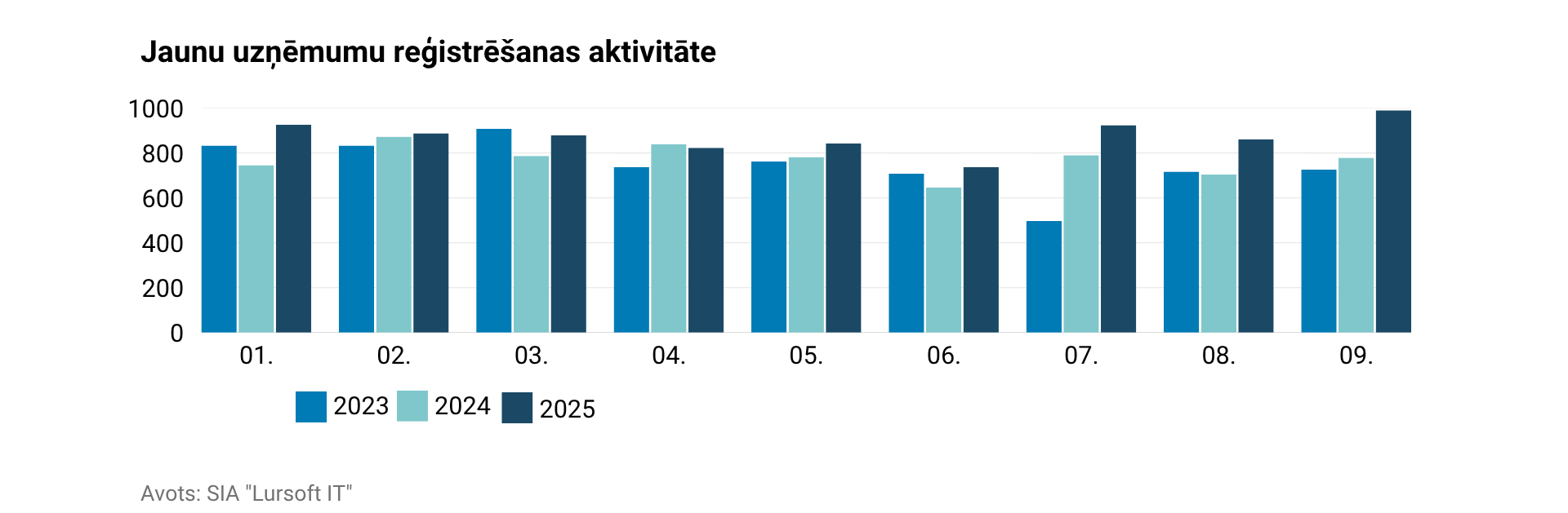 2025.gada septembrī jaunu uzņēmumu reģistrēšanas aktivitāte Latvijā uzrādījusi ievērojamu kāpumu – reģistrēti 990 jauni uzņēmumi ar kopējo pamatkapitālu 3,91 milj. eiro, liecina sabiedrības ar ierobežotu atbildību “Lursoft IT” dati.